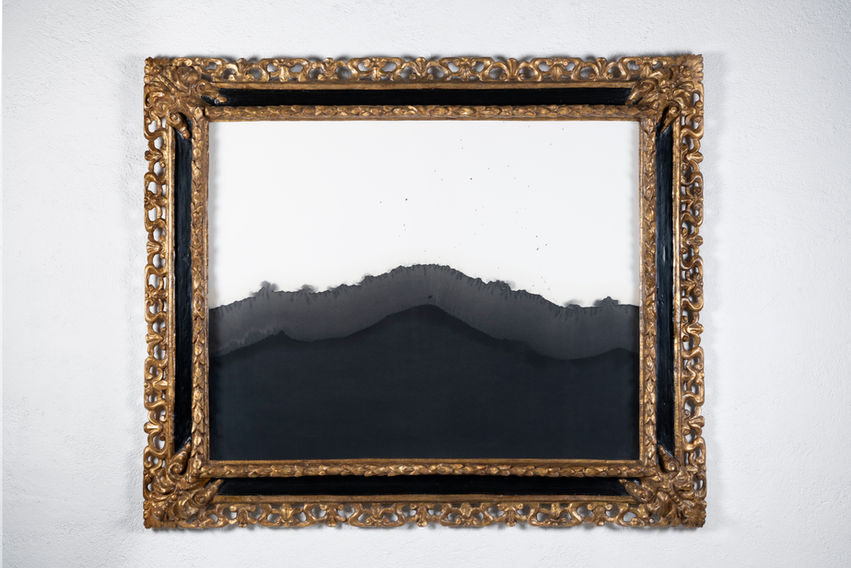 The frame around these presumed Romantic “landscapes” is therefore intended to confirm their genre by playing with the memory we have of similar 19th-century “paintings,” seen in some museum or picture gallery. So we have to admit that the frame also has a gnosiological value, inasmuch as it does not just have the function of setting off or protecting the work. It is not a decorative expedient to seduce, to attract the visitor. With it, the artist wants to surround and circumscribe the image: surround with a certain aura the image that has been generated by the pouring of used oil. Circumfusing the image with an aura also signifies confusing the image with the aura, i.e. veiling and illuminating it at one and the same time, in other words un-veiling it. In addition, the frame encloses and circumscribes the image: it circumscribes it in the way that a window does with the landscape. And restoring an aura to the image means taking a certain distance from it, presenting it as a dream or recollection of something lost, faded, forgotten. Walter Benjamin described the aura in these terms: «Aura is the appearance of a distance however close it might be. Words themselves have an aura; Kraus described this in particularly exact terms: “The closer one looks at a word, the greater the distance from which it returns the gaze”».