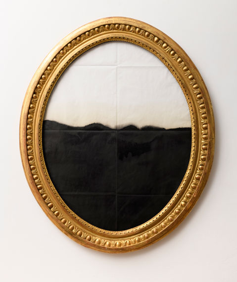 On entering the central room of the Galleria Stein in Milan we find a series of works by Paolo Canevari (Rome, 1963). It is not the first time that the Roman artist has presented his creations in this setting with its air of antique elegance. The dimensions of the space are fairly impressive, due both to the height of the ceiling and to the large size of the windows that open onto a romantic garden, letting in the light of day. The artist has conceived a site-specific display made up of works created over the last few years along with something new that he has produced for the occasion. They are paintings and sculptures executed using materials derived from the chemical and petroleum industries, along with elements made of wood and gold and paper. The works on the wall are positioned in relation to the large windows in a way that creates something resembling a horizon. The “paintings” on paper have been made by pouring used motor oil over the surface and then set in antique gilded and elaborately worked frames. Canevari has acquired them from antique dealers, choosing them for the quality of their carving, their elegance and their flourishes, as if to contrast the nobility of these decorative frills with the prosaic aura of the fluid. And yet the frames, in this case, are not ornamental accessories. On the subject of frames Kant has written: «Even what we call ornaments [parerga], i.e. those things which do not belong to the complete representation of the object internally as elements but only externally as complements, and which augment the satisfaction of taste, do so only by their form; as for example [the frames of pictures, or] the draperies of statues or the colonnades of palaces. But if the ornament does not itself consist in beautiful form, and if it is used as a golden frame is used, merely to recommend the painting by its charm, it is then called finery and injures genuine beauty». Here the frames around the paintings function as windows opening onto distant landscapes. They also contextualize the primary sense of the images they enclose, revealing them to be landscapes. Looking at the pictures from closer up, we see that they are not painted in the traditional way and are all of the same dark, oily color, with no naturalistic details apart from profiles that correspond in an abstract, minimal sense to hills and low mountains with sinuous curves.